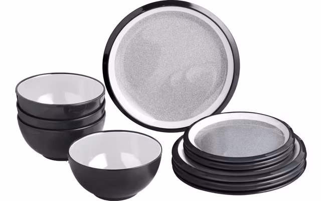 Med dette 12-delte melaminserviset kan du nyte måltidene dine i en smakfull atmosfære. Servisesettet er lett, av høy kvalitet, robust og slitesterkt. Takket være bruken av en anti-skli forsegling integrert i bunnen av tallerkenen, blir det betydelig vanskeligere å gli og eventuelt falle av oppvasken. I tillegg reduseres den skranglelyden under kjøring betraktelig.